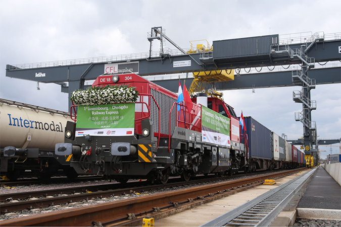 2019年4月4日,首趟卢森堡至成都中欧班列在卢森堡迪德朗日铁路场站准备出发。班列途经德国、波兰、白俄罗斯、俄罗斯、哈萨克斯坦等国,由中国新疆阿拉山口口岸入境。