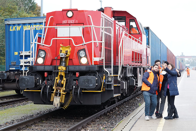 2021年10月26日,在德国汉堡,中德铁路工作人员与顺利抵达的首列“上海号”中欧班列合影。9月28日,首发“上海号”列车装着50个满载货物的集装箱,从上海一路向西,经新疆阿拉山口口岸出境,开往汉堡。