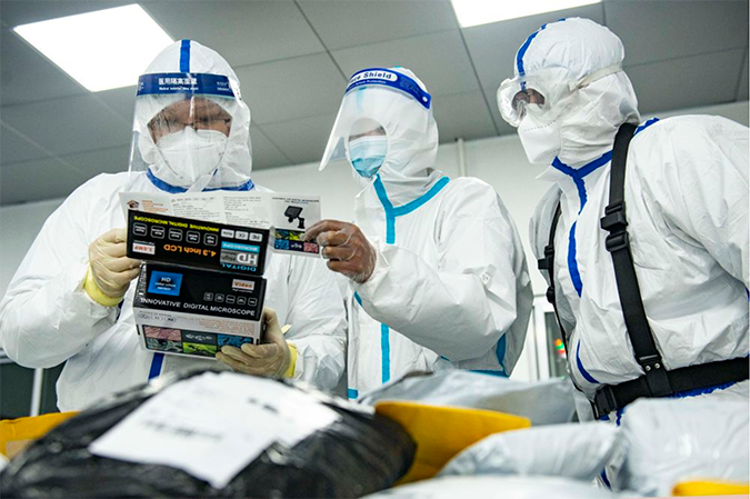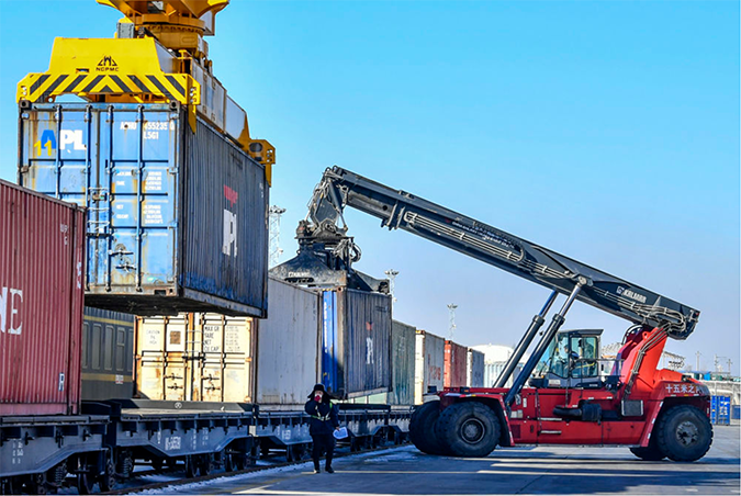 2021年2月6日,新疆阿拉山口海关工作人员在抽检中欧班列货品。新冠肺炎疫情发生以来,中欧班列承接空运、海运转移货源,实现逆势增长。