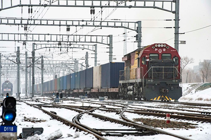 一列中欧班列通过新疆阿拉山口口岸出境。