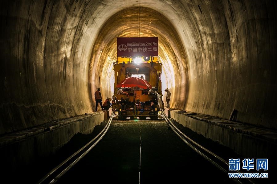 随着每排14根轨枕按照规定距离平稳铺过庚凯村隧道,500米长钢轨随着牵引机稳准落定,中老铁路铺轨23日通过第一座隧道,从老挝首都万象一路向北。 (图片来源:新华社 凯乔摄)庚凯村隧道位于万象市北部,全长661米。在施工现场,隧道口处的气温达到39摄氏度,路面和钢轨热得烫脚。在现场作业的中老两国工人不时就要停下来,喝一小瓶“饮料”来防暑。