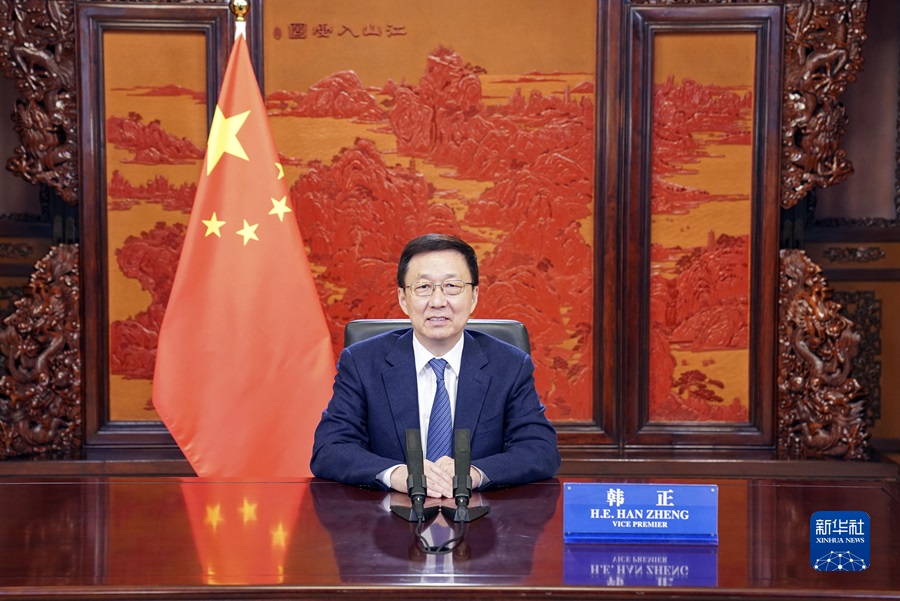 10月18日,中共中央政治局常委、国务院副总理韩正在北京以视频方式出席第二届“一带一路”能源部长会议并发表致辞。 新华社记者 殷博古 摄